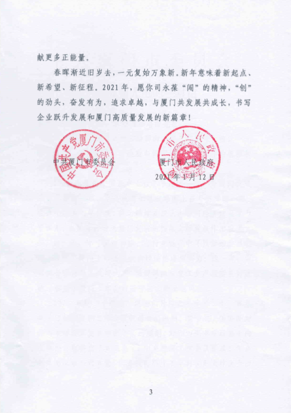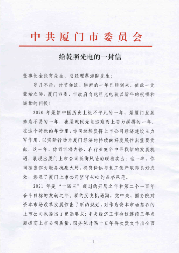 近日,乾照光電收到中共廈門市委員會(huì)的來(lái)信,信中廈門市委、市政府對(duì)于我司過去一年的發(fā)展給予了積極的評(píng)價(jià),并在一元肇始之際,對(duì)我司表達(dá)了新年的祝福和誠(chéng)摯的問候,同時(shí)就我司2021年的發(fā)展規(guī)劃做出重要指引。