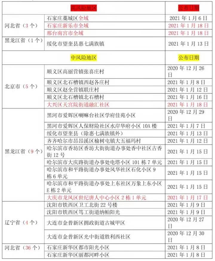 截至2021年1月19日18時(shí),全國(guó)現(xiàn)有高風(fēng)險(xiǎn)地區(qū)4個(gè),現(xiàn)有中風(fēng)險(xiǎn)地區(qū)60個(gè):
