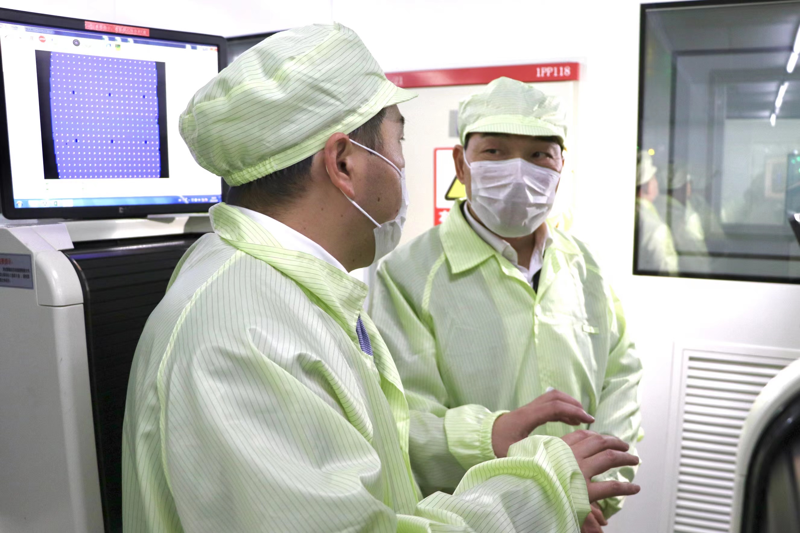 在公司展廳,熊書記一行聽取了劉兆關(guān)于乾照光電發(fā)展歷程、企業(yè)文化、建設(shè)規(guī)劃、主營產(chǎn)品及公司榮譽(yù)的匯報。熊書記圍繞企業(yè)生產(chǎn)經(jīng)營、技術(shù)創(chuàng)新、勞動用工等方面與劉兆進(jìn)行交流與探討。隨后,熊書記一行前往外延片、芯片生產(chǎn)車間參觀考察,認(rèn)真了解企業(yè)生產(chǎn)經(jīng)營情況,觀摩外延片制造和芯片黃光站、蒸鍍、點(diǎn)測等車間生產(chǎn)的工藝及流程。