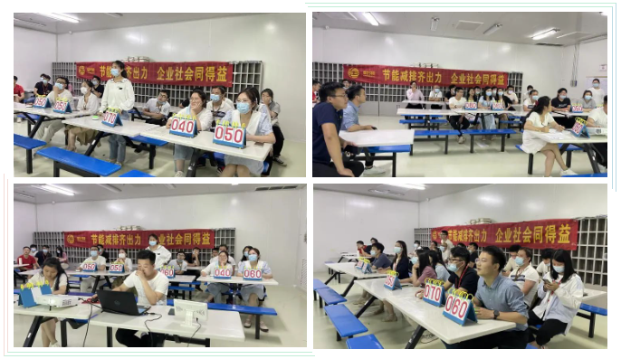 隨后,在公司培訓(xùn)室又進(jìn)行了一場(chǎng)關(guān)于能源管理的培訓(xùn)并同步開展知識(shí)答題競(jìng)賽活動(dòng)?,F(xiàn)場(chǎng)共吸引30名員工參與,經(jīng)過工作人員系統(tǒng)講解能源和環(huán)保管理等方面的相關(guān)知識(shí)后,緊張而又激烈的知識(shí)競(jìng)賽就開始了!競(jìng)賽中,五人一組,隨機(jī)搶答,選手們?nèi)褙炞?、認(rèn)真思索,以昂揚(yáng)的斗志、飽滿的熱情投入到比賽中?,F(xiàn)場(chǎng)氣氛活躍,最后經(jīng)過激烈PK,六名選手獲得了本次比賽大獎(jiǎng)!