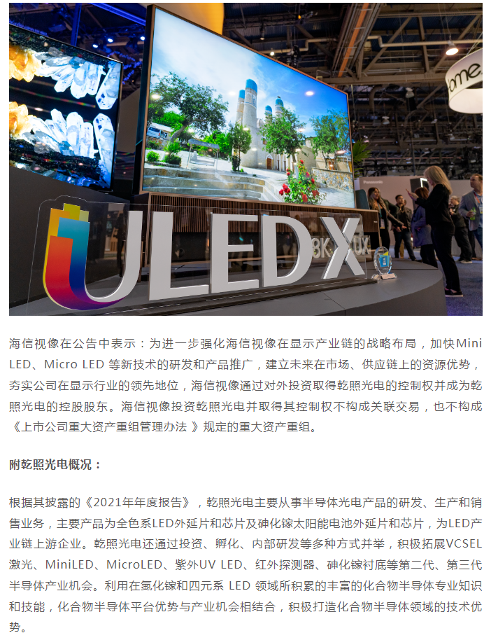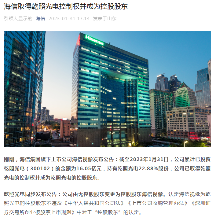 2023年1月31日,海信視像與乾照光電共同發(fā)布公告,認(rèn)定海信視像為乾照光電的控股股東。